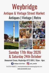 Weybridge welcomes a unique Antiques & Vintage market with traders and enthusiasts offering a mixture of antiques, collectables, curios, vintage, retro, bric-a-brac, vinyl records and a whole lot more….We will be trading in the heart of Weybridge, offering an interesting and unique experience. If you feel you would like to trade with us please contact us for details). A fun day out for all the family.